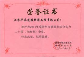 公司被評為2011年度揚州市“建筑業(yè)綜合實力20強(qiáng)企業(yè)”